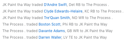 Which brings me to my next point.. Never feel attached to your players. If someone is offering you a trade, LISTEN! I cannot stress this enough. Never be complacent.. I dont give a damn if you 3-0 or 0-3, dont be comfortable. Got some depth? Upgrade somewhere… Need to find another WR? Trade that underperforming 1st rounder. A players value does not equate to where they got drafted 🙅🏾♂️. Dont let someone convince you Jeremy Mixon is an RB1 because they reached and picked him 5th. Everything is fluid, players values go up and down everyday b..