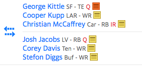 Hello again… Well lets get the chaos out the way. We got a COVID scare, the first legit one of the year. For those starting any Steelers or Titans players make sure to keep watch of your lineups and take advantage of those IR spots. There is a rumor that the game will be played Monday but nothing confirmed yet. Gotta be fluid with these rosters…